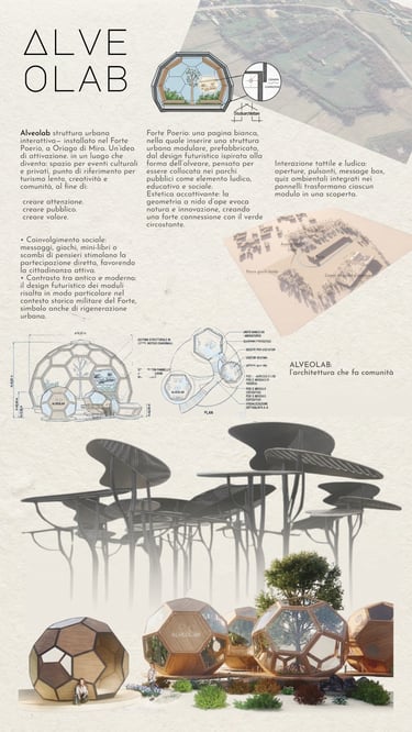 ALVEOLAB è una struttura urbana modulare, prefabbricata, dal design futuristico ispirato alla forma dell’alveare, pensata per essere collocata nei parchi pubblici come elemento ludico, educativo e sociale. Ogni modulo ha una funzione diversa: dalla sala lettura e giochi ai messaggi segreti, ai quiz ambientali, dalle mini-librerie alle pareti tattili. Il Parco di Forte Poerio, a Oriago di Mira, è uno spazio pubblico caratterizzato da aree attrezzate per bambini, tavoli da picnic e barbecue.