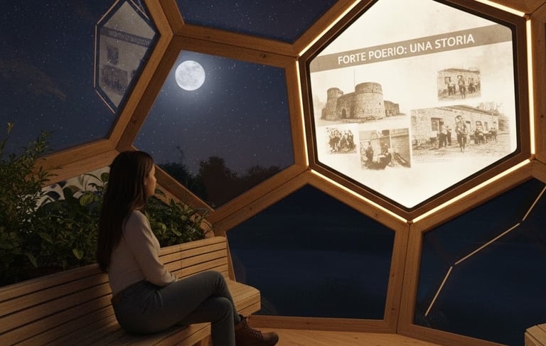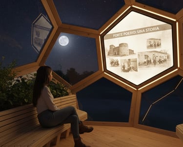 Contrasto tra antico e moderno: il design futuristico dei moduli risalta in modo particolare nel contesto storico militare del Forte Poerio, simbolo anche di rigenerazione urbana.