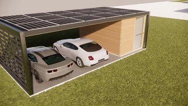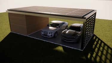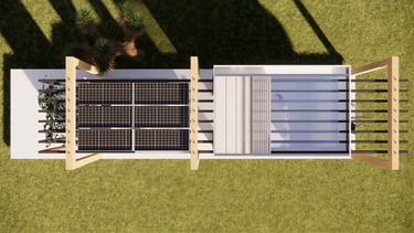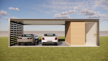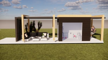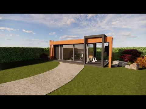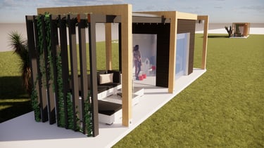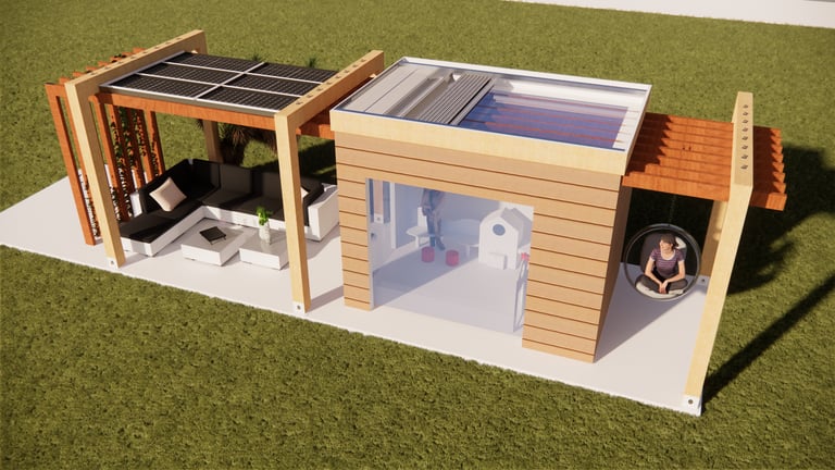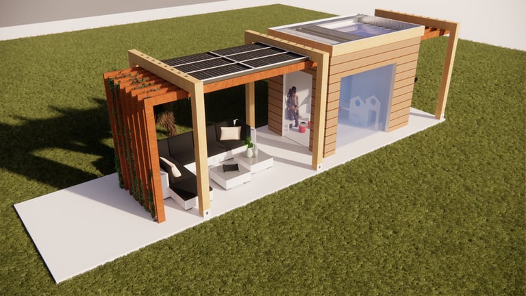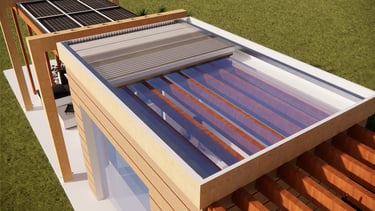 Un progetto che coniuga la semplice pergola mirata alla protezione dal sole in area relax esterna, ad una piccola dependance dal tetto in vetro (e oscurante interno).