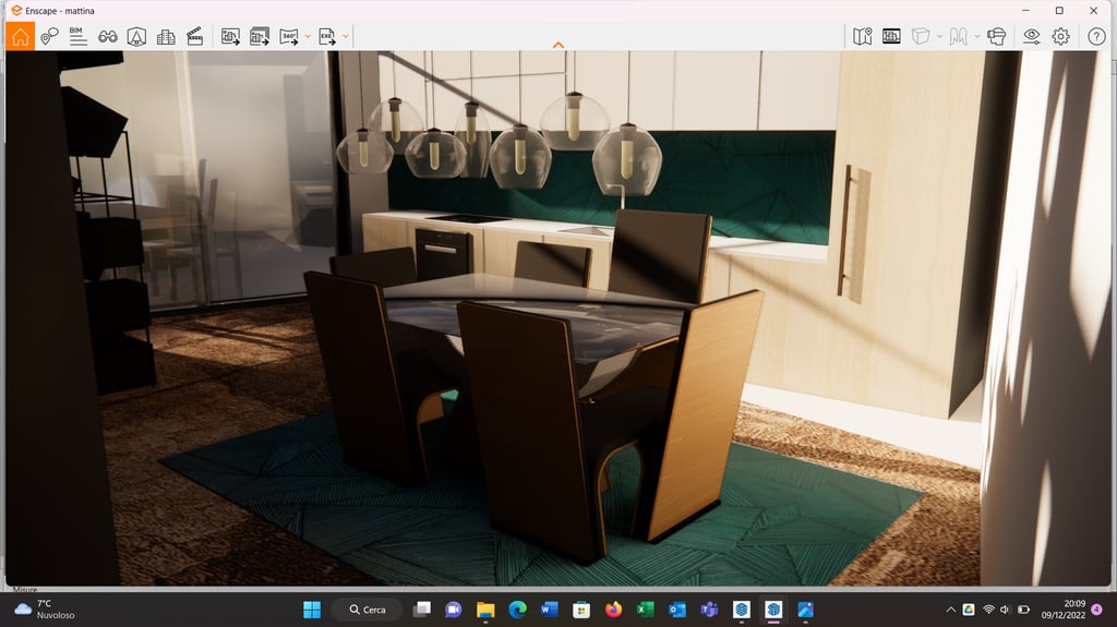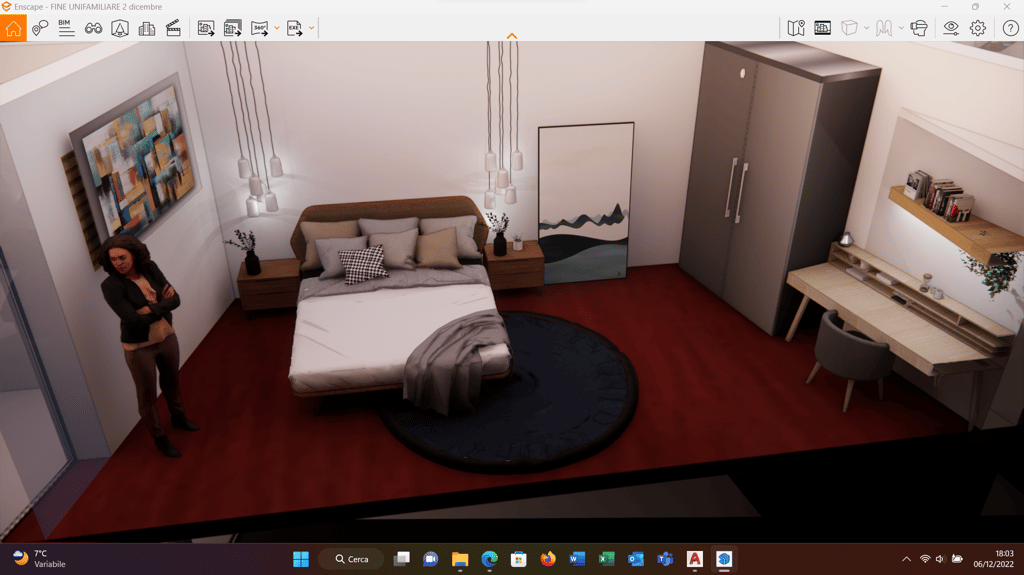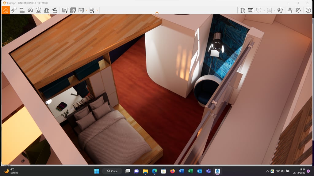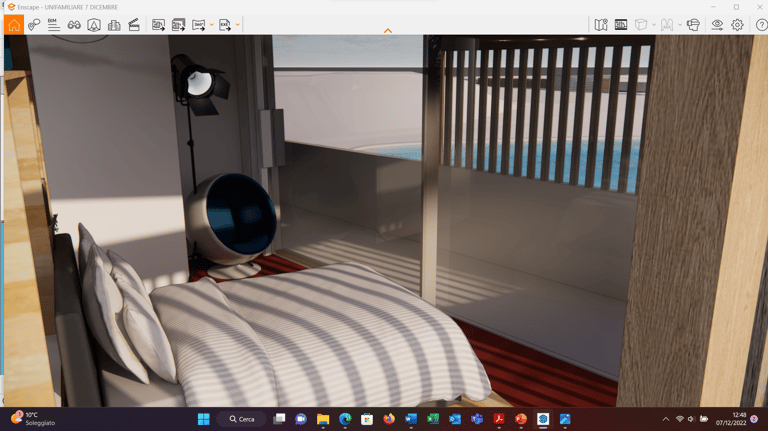 nella camera padronale la specchiera è retro illuminata, ma funge anche da mensola per suppellettili e libri. In tal modo lo scrittoio, funge anche da toilette trucco;