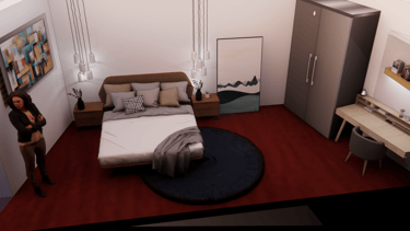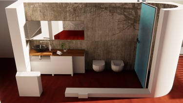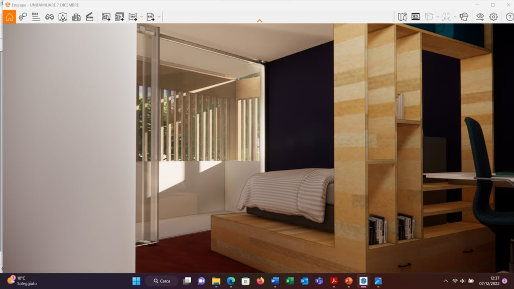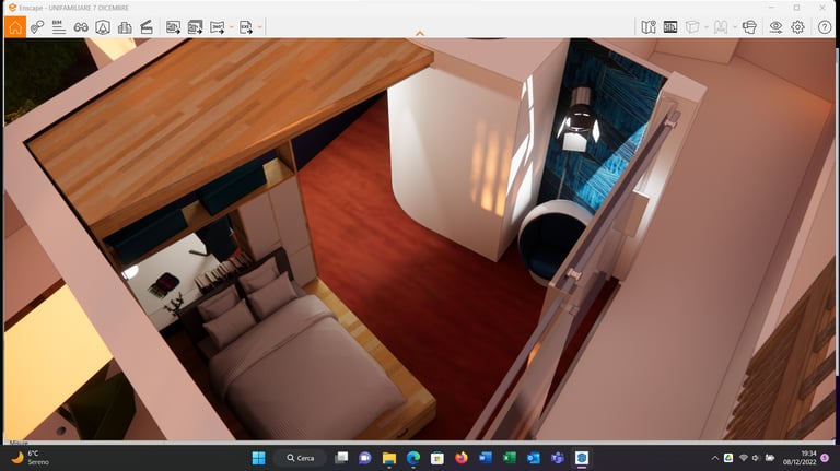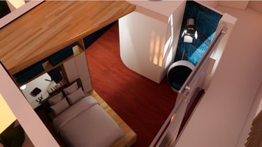 nella camera singola, è stato disegnato il mobilio, adatto ad una geometria dell'ambiente, atto a sfruttare al meglio la luce naturale che, penetrando attraverso i vuoti della libreria, giunge sin sullo scrittoio. Il contrasto di colori con la parete blu/avion, insieme al controsoffitto illuminato a spot, realizza un "invito" di sicuro effetto in uno spazio piccolo e stretto.