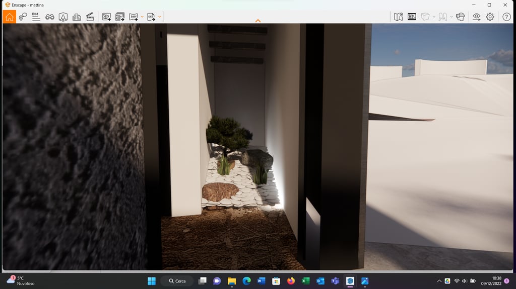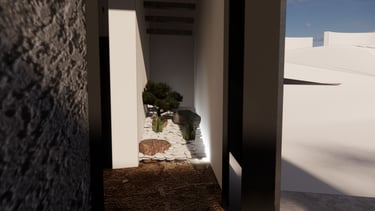 Ingresso arricchito da un giardino zen che occupa il sottoscala, un tempo adibito a piccolo ripostiglio chiuso dietro una porta. Eliminata quest'ultima e prevedendo un'opportuna illuminazione con piccoli spot tra i ciottoli, l'ingresso assume un sicuro effetto scenografico.