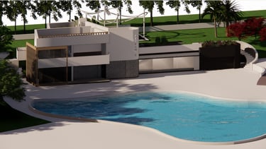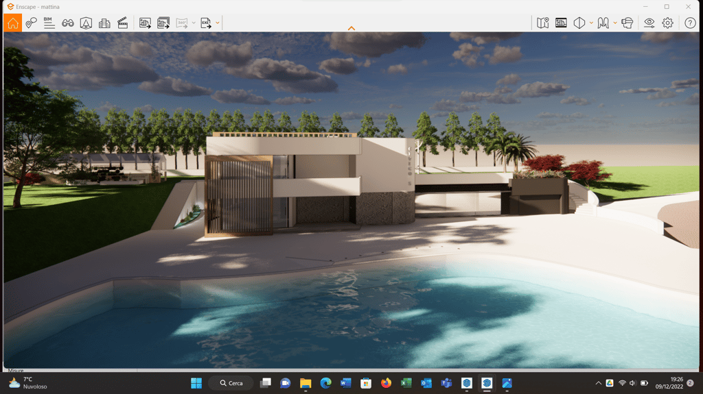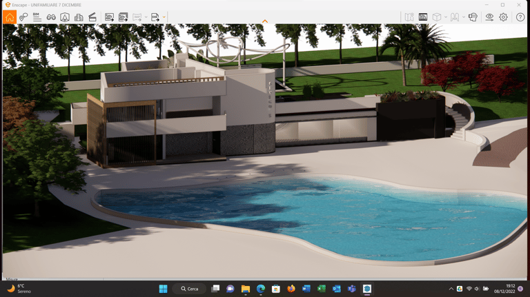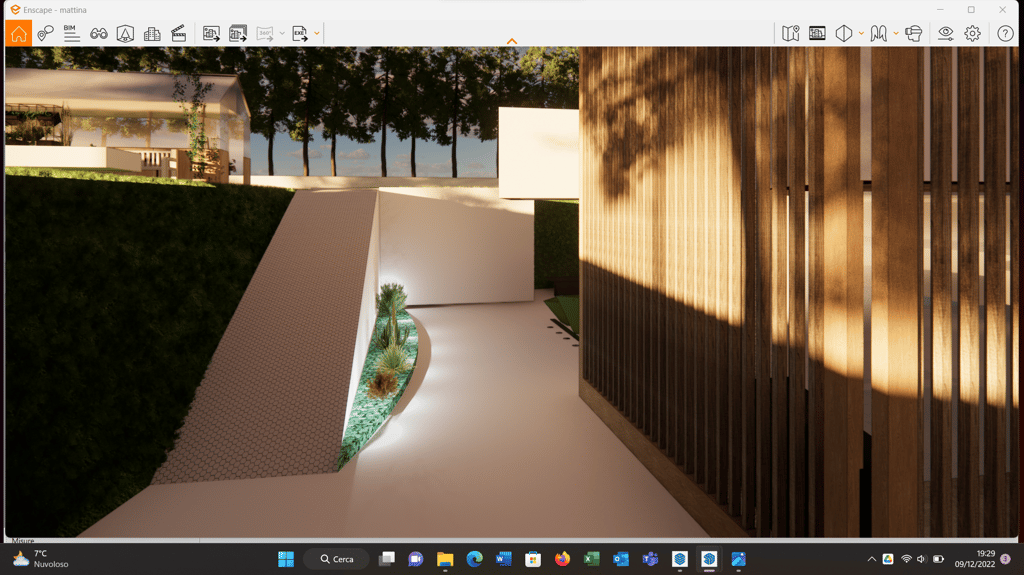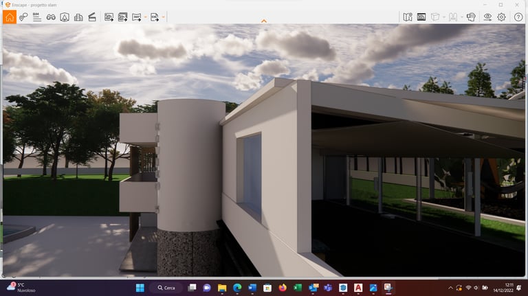 Elementi cardini: una scala esterna che rende indipendente la villa dagli spazi sotto pergola (semichiusi), pensati per una futura trasformazione in ufficio.