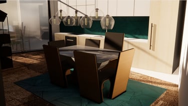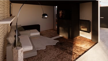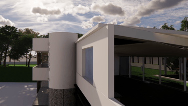 Sul fronte ovest del fabbricato, una zona giorno esterna attigua alla la cucina interna, regala uno spazio semiprivato per pranzi all'aperto, schermati anche dal frangisole a tutt'altezza, volutamente non parallelo al fronte dell'edificio, al fine di creare una sorta di cono ottico e, contestualmente, una linea d'ombra.